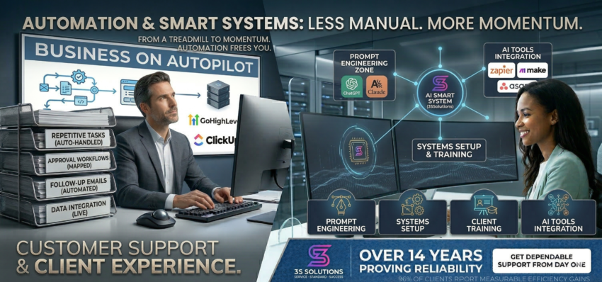 At 3S Solutions, we’ve spent over 14 years watching businesses bleed time on tasks that should never touch a human hand. We’ve also spent those same years building the systems that fix it. From simple workflow automations to full AI tool integration and custom prompt engineering, we build smart, reliable systems that do the repetitive work so your team can focus on the work that actually matters.